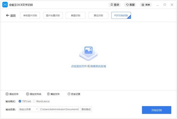 这里可以对PDF文档的文字内容进行识别,可以通过添加文件、拖拽、添加文件夹的方式上传PDF文档。