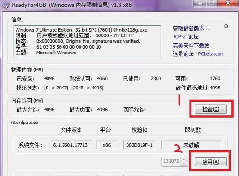 1、下载安装并运行ReadyFor4GB.exe工具,分别点击“检查”和“应用”按钮。