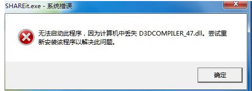 当电脑中缺少该文件,在运行程序的时候会弹出“无法启动此程序,因为计算机中丢失D3DCOMPILER_47.dll.尝试重新安装该程序以解决问题”的报错窗口,是程序无法正常的运行