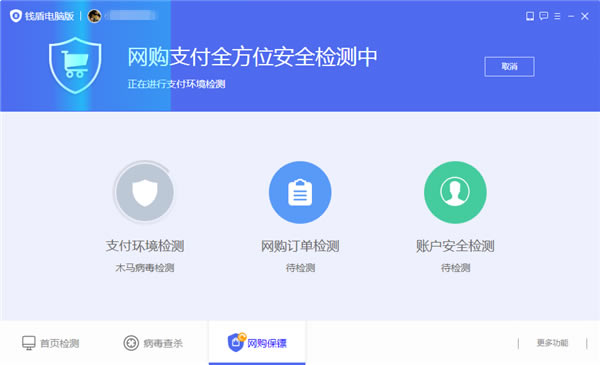 3、正在进行支付环境检测,钱盾会进行木马病毒检测,还有网购订单和账号安全保护功能。