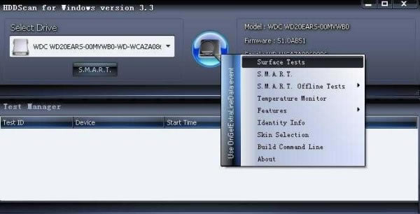 5、点击最下方的TestManager任务窗口里的测试项目,即双击TestID下面WDCWD20EARS,即可弹出详细的检测窗口。