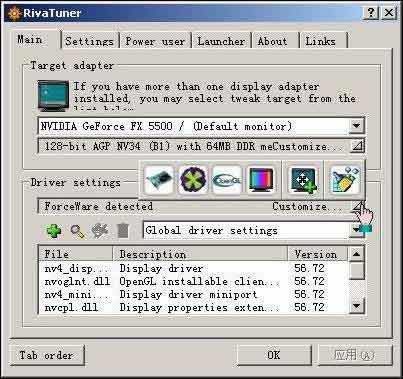 我们再细心地看看RivaTuner全局,会发现其主界面包含六个子界面,它们包括:Main(主要设置)、Settings(扩展设置)、Power user(高级用户)、Launcher(命令执行)、About(软件简介)、Links(联系)等六个面板。后五个面板并没有太大的作用,而RivaTuner最主要的功能都安排在Main面板上,本文就以它作为重点介绍:Main面板主要分两大部分,上半部份的Target adapter设置可用来直接操作控系统和底层硬件,改卡等设置可在这里找到,但现在我们先不说这一部分,因为它的设置功能不够丰富,而且操作起来危险性比较大。我们还是选来看看主面板下面的Driver Settings(驱动设置),点开Customize...后面的小三角按钮(第一次启动RivaTuner时,它会有闪烁提示),我们可看到有可看到有几个按钮图标弹出,它们分别是System settings(系统设置)、DirectDraw and Direct3D settings(D3D设置)、OpenGL settings(OpenGL设置)、Desktop and overlay Color schemes(色彩设置)、Costom display mode / refresh rate wizard(刷新率设置)、Restar all the dirver's settings to their default values(复位设置)。这些设置加起来有数十个子面板,下面先为大选介绍一些常用的、重要的设置选项。