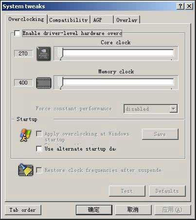 这个面板拥有一个很常用的性能提供面板——Overclocking(超频),大家只要选上Enable driver-level hardware overc,就可打开超频设置,移动滑杆选定核芯和显存频率后,按“Test”对设置进行简单的内部测试,看看硬件能否承受高频压力,通过测试后我们可再选上Apply overclocking at windows startup,哪么当系统启动后就会自动进行超频设置,我们日后都无需再对行进行修改了。而为了考察超频的稳定性,还是建议大家每次调整频率之后运行一下3Dmark03或FarCry等游戏来考察显卡能否稳定工作,看看是否会死机、画面破碎等,如没有的可以继续提升工作频率,当找到合理的超频点后便不需要再改变了。