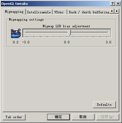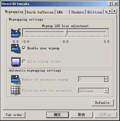 我们先来看看D3D的第一个子面版:Mipmapping。移动MipMapping Setting的滑动杆,如果设定小于0的话,就可以能够让你在不损失性能的前提下获得更加锐利的画面,不过不要太小了,否则容易产生纹理闪烁现象,建议选择-1即可。其实调低Mipmapping LOD只是直接应用更高分辨率的纹理而已,并不会增加像图形芯片进行过滤时所需的数倍运算量和带宽,当然更大的纹理还是会增加一点纹理读取带宽的,但是这和各向异性纹理过滤的带宽需求量相比无疑要低的多。