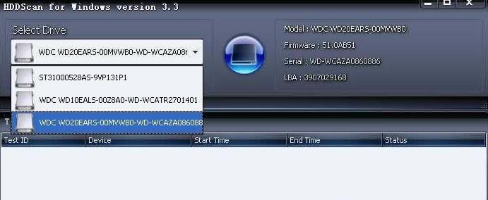 从Select Drive处,点那个下拉三角箭头,选择待选择的硬盘,如本次将扫描的WD20EARS西数2TB硬盘。