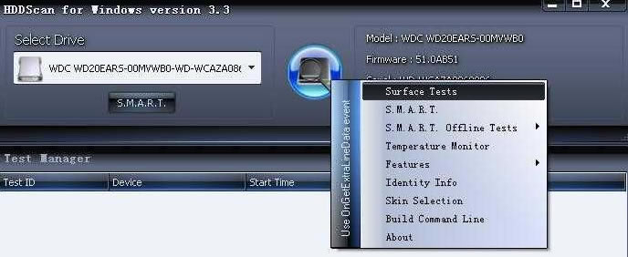 4 、将鼠标移动到中部的硬盘图标上,点击左键,在弹出菜单里选择Surface Tests仔细测试键。