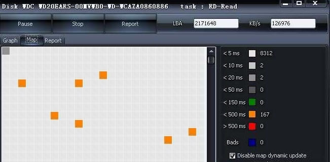 而后点击Map按钮,可以直观的查看硬盘扇区的扫描情况,包含扫描位置、扫描速度、扇区扫描所用时间等。这里重点要查看>500MS和Bads,Bads即硬盘坏道,通常超过2个坏道以上的硬盘建议尽快保修。>500ms的区域可能为假性坏道,或者发展成为坏道也要注意。