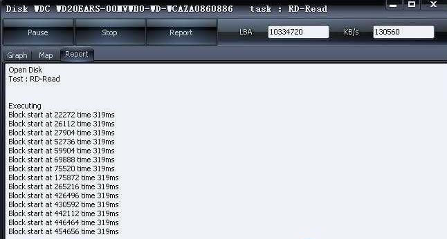 Map:以图形的形式显示逻辑扫描的结果,以不同的色块表示磁盘表面的状况,其中蓝色表示坏块(注意这里的单位是Block size)。右方显示了扫描过程中的统计结果。