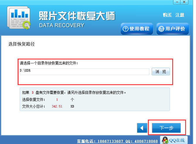 5、点击“浏览”按钮自定义选择文件的存储位置,再点击“恢复”按钮对选中文件进行恢复操作,恢复工作完成后点击提示框的确定按钮就能查看到文件了。